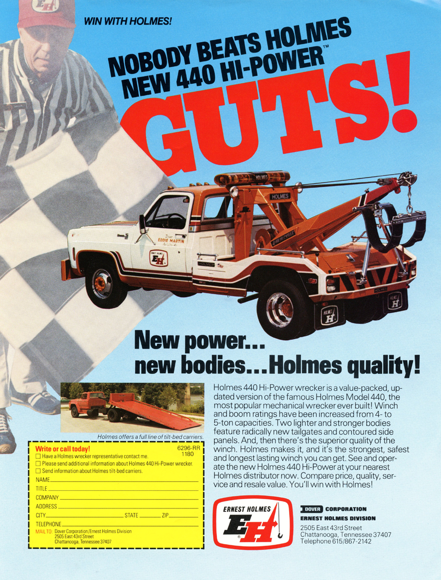 HOLMES 440 In the late 50’s and early 60’s Holmes was marketing the 400 and 400 RW wreckers to service stations; and they developed the new Holmes 440 for this market. Moving away from channel and angle iron frames the 440 offered a stylish formed steel head frame and body assembly with an extendable boom center section. The first 440 was serial # A66CF – 101 and was shipped Jan 11, 1966 – all 440’s had “CF” as the ID code; 440 Hi Power were coded “CFH” and the rare factory hydraulic units had “HYD” at the end of the serial number.